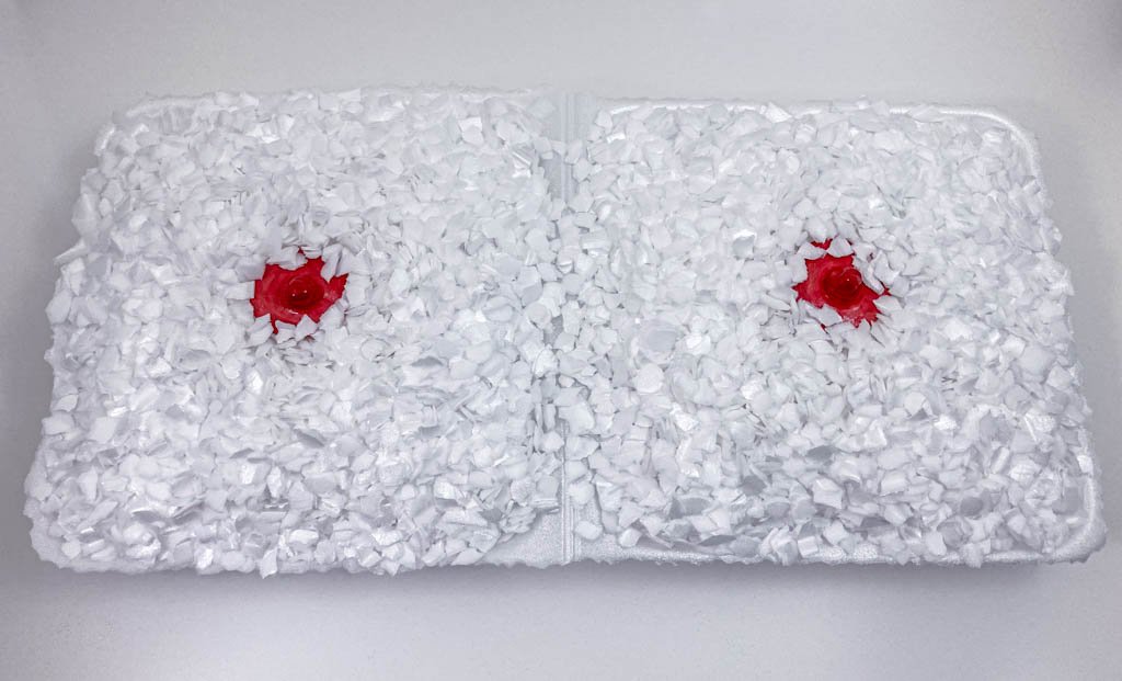 Jan 14 Written By Marina Kuchinski Focal Symmetryceramic, reused styrofoam container, shredded reused styrofoam, 17" x 8" x 3”, 2023 Marina Kuchinski
